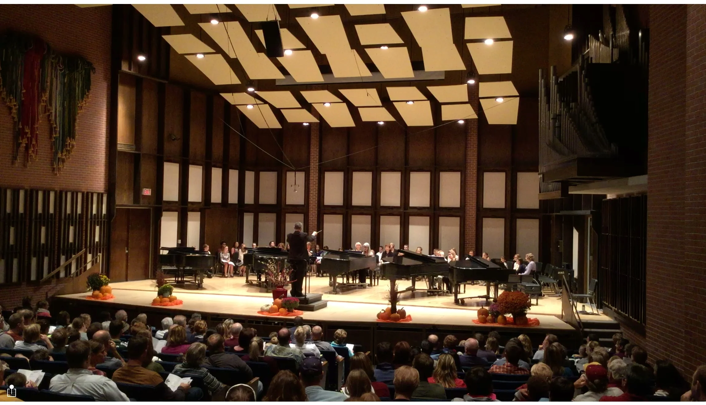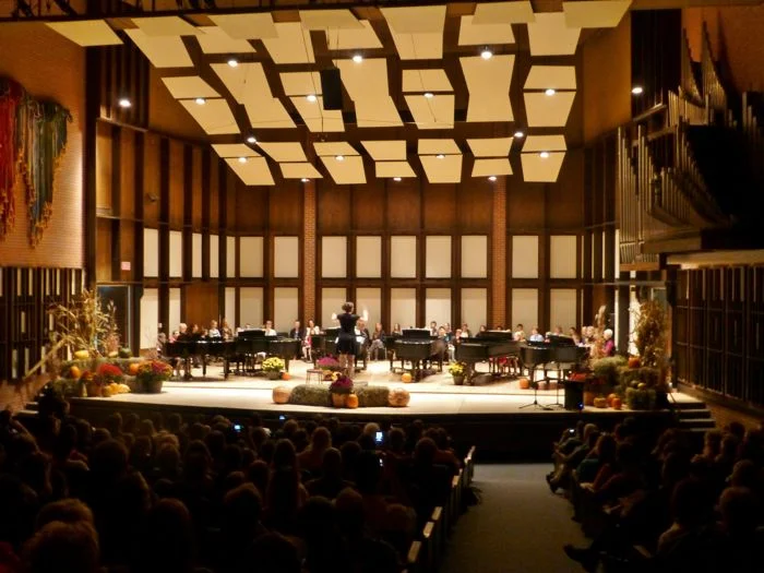Monster Concert is a performance event held every other year, in the fall at the University of Wisconsin - River Falls. For the pianists, this is a duet concert, played on multiple grand pianos with up to 12 other pianists performing the same piece. For the instrumentalists/vocalists, this is also an ensemble performance with multiple students performing the same piece.